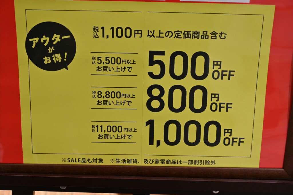 アウター全般、一定金額以上の購入で更に割引になったり