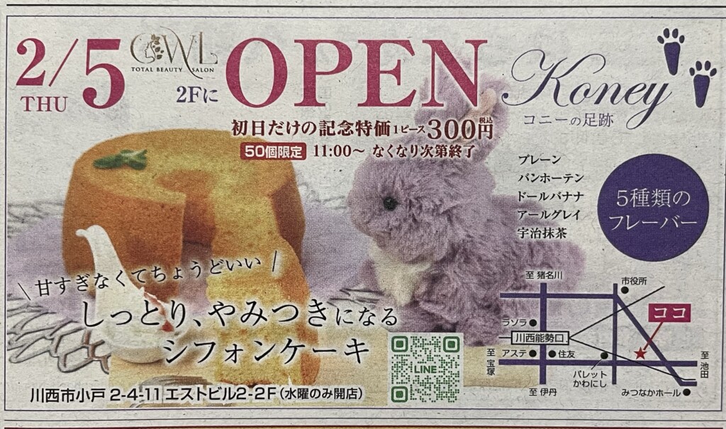 2/5(木)、川西市小花にコニーの足跡っていうシフォンケーキ屋さんができるようです!