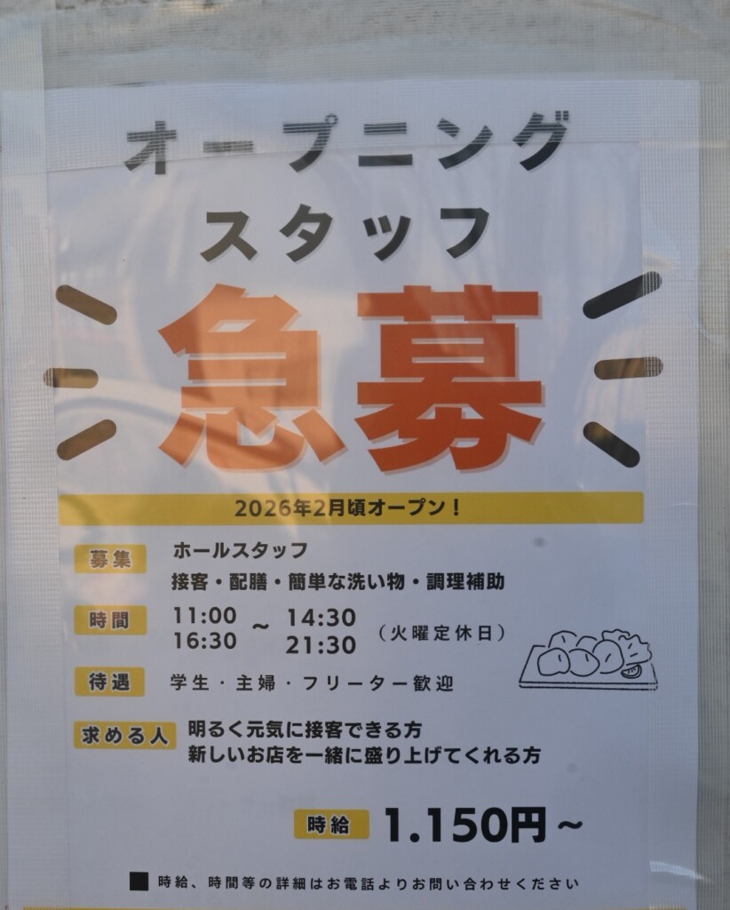 店頭では「オープニングスタッフ急募!」と、2月頃のオープンが告知されています。