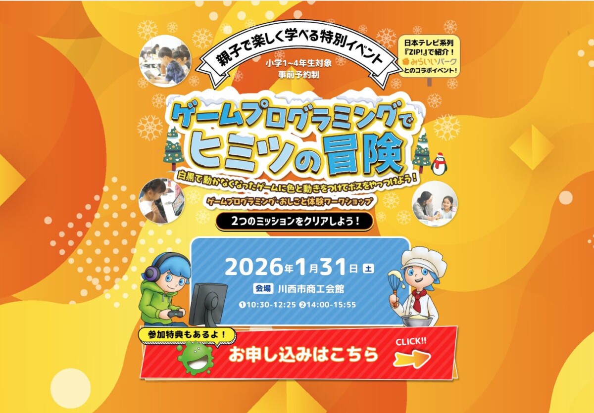 1/31(土)、川西市商工会館で「ゲームプログラミングでヒミツの冒険」が開催されるようです!