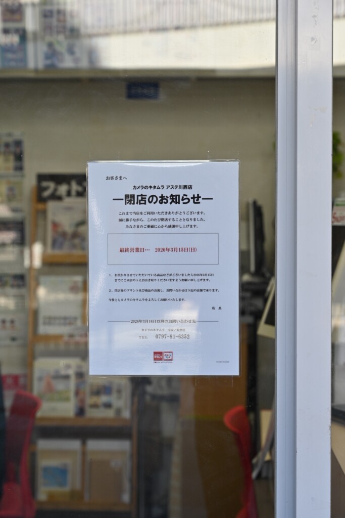 カメラのキタムラ アステ川西店が3/15(日)で閉店するようです。