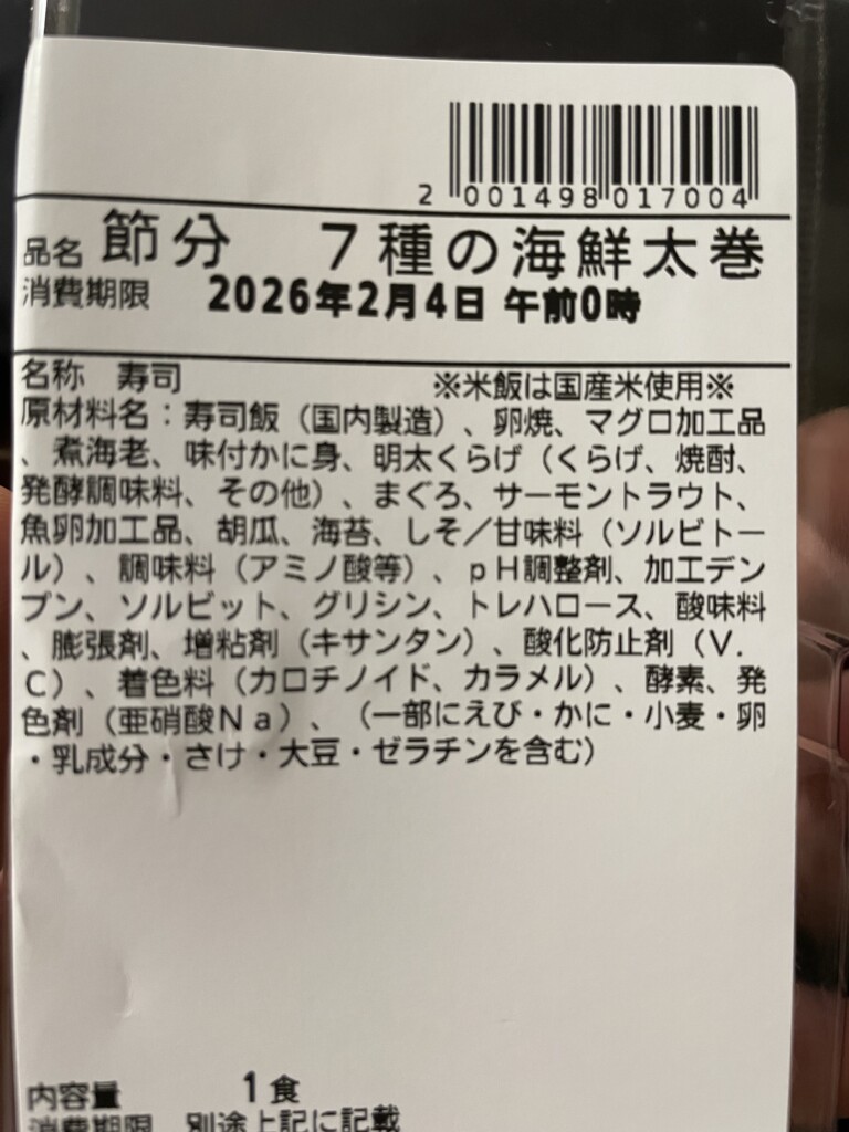 2024年の節分の7種の海鮮巻き(右)を思い出すと、もうちょっと肉厚で寿司飯が多かった気がします。
