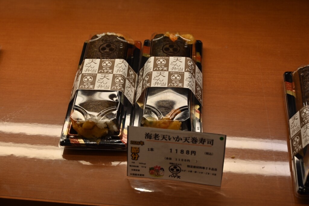 こちらは天ぷらが美味しい銀座ハゲ天の海老天いか天巻寿司(¥1188)。
