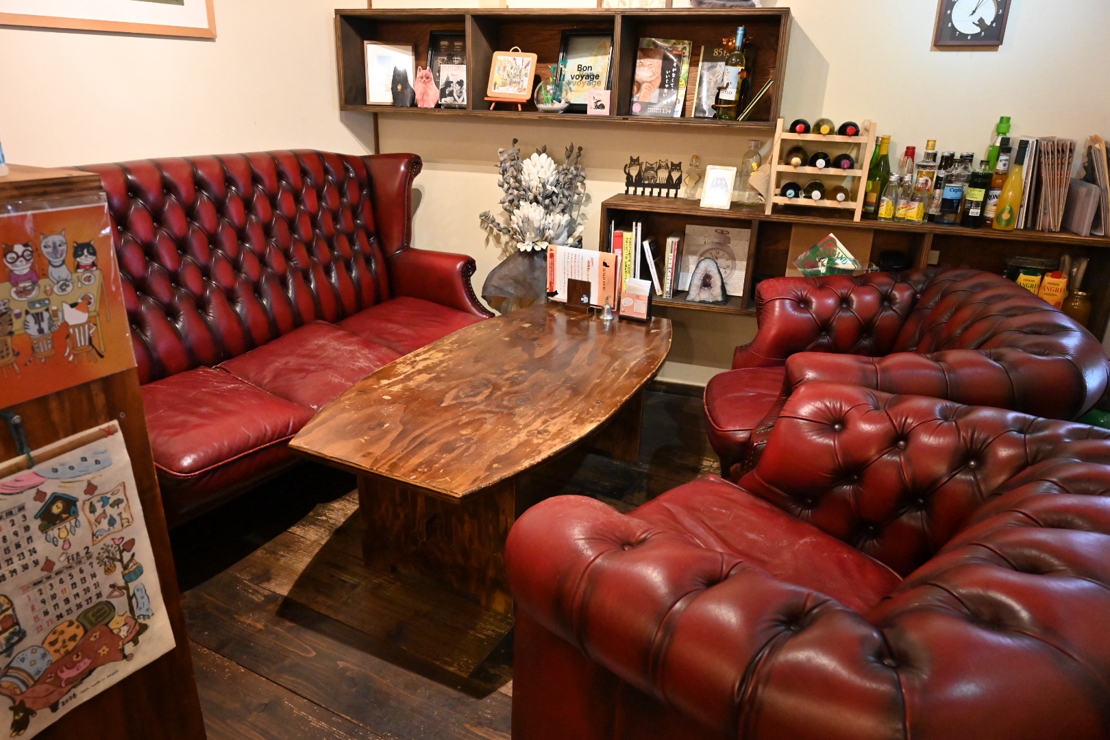 チェスターフィールドの立派な革張りのソファ席があります。