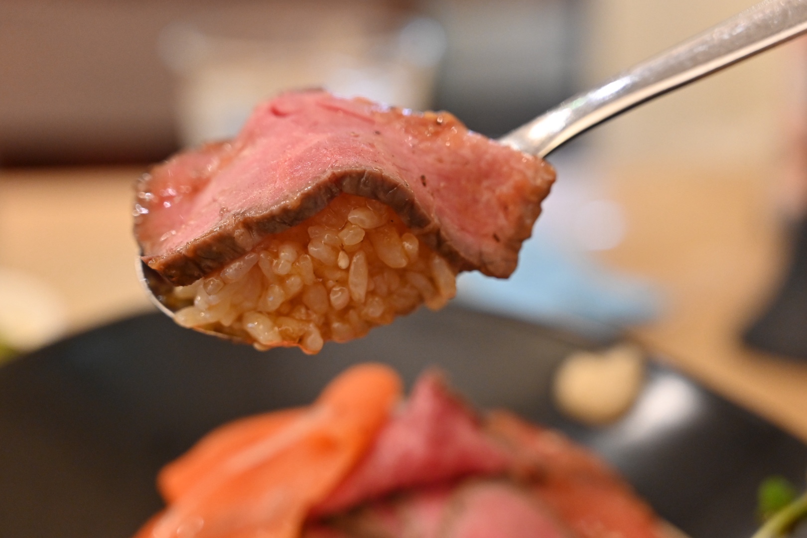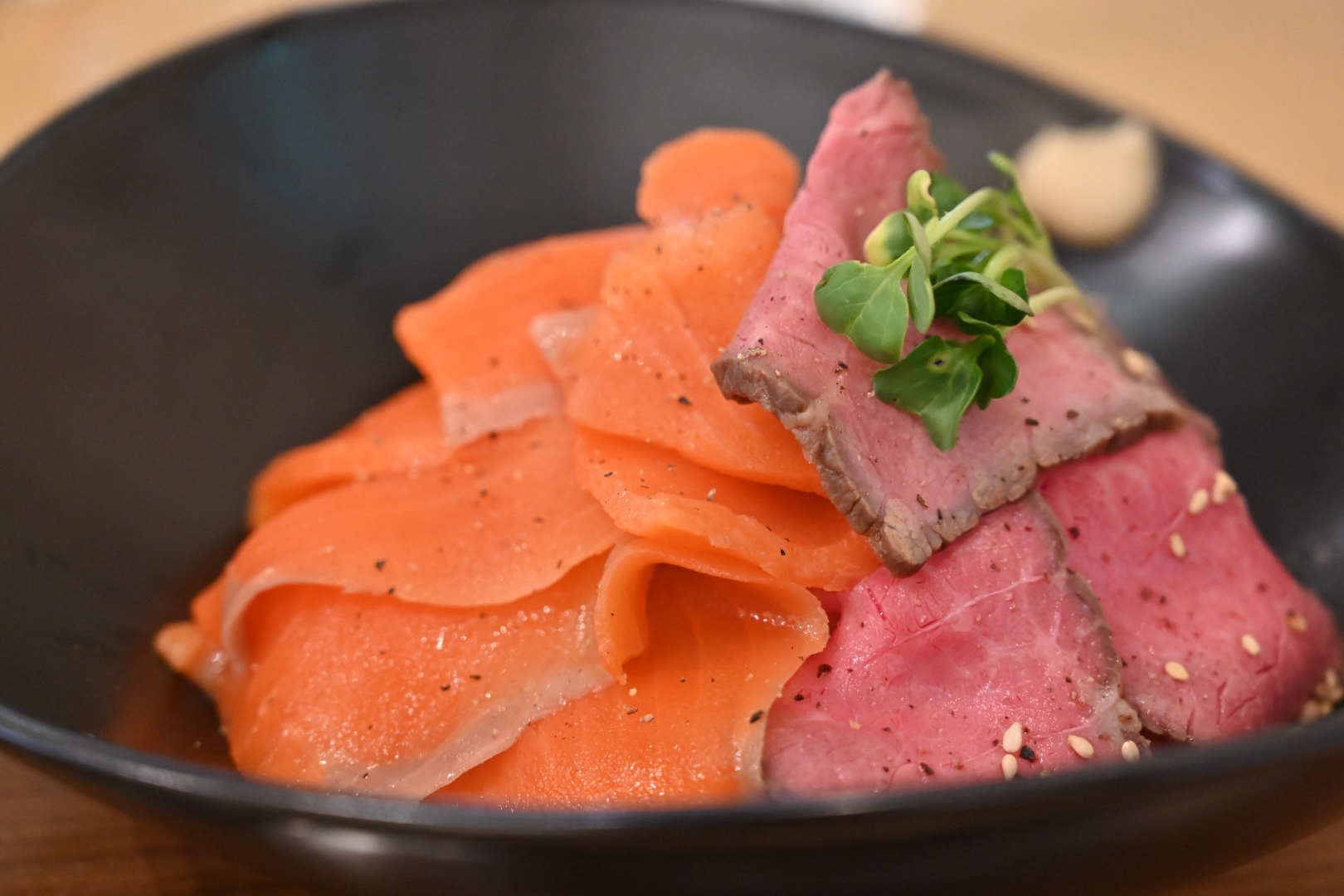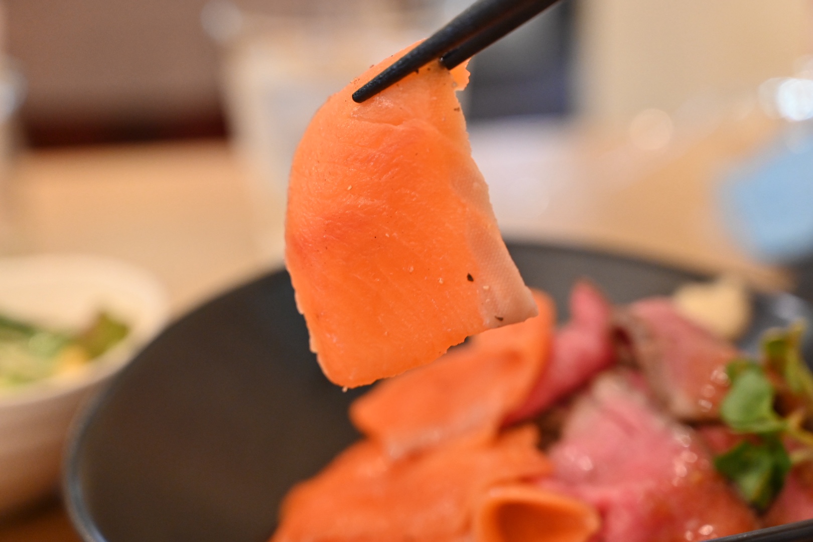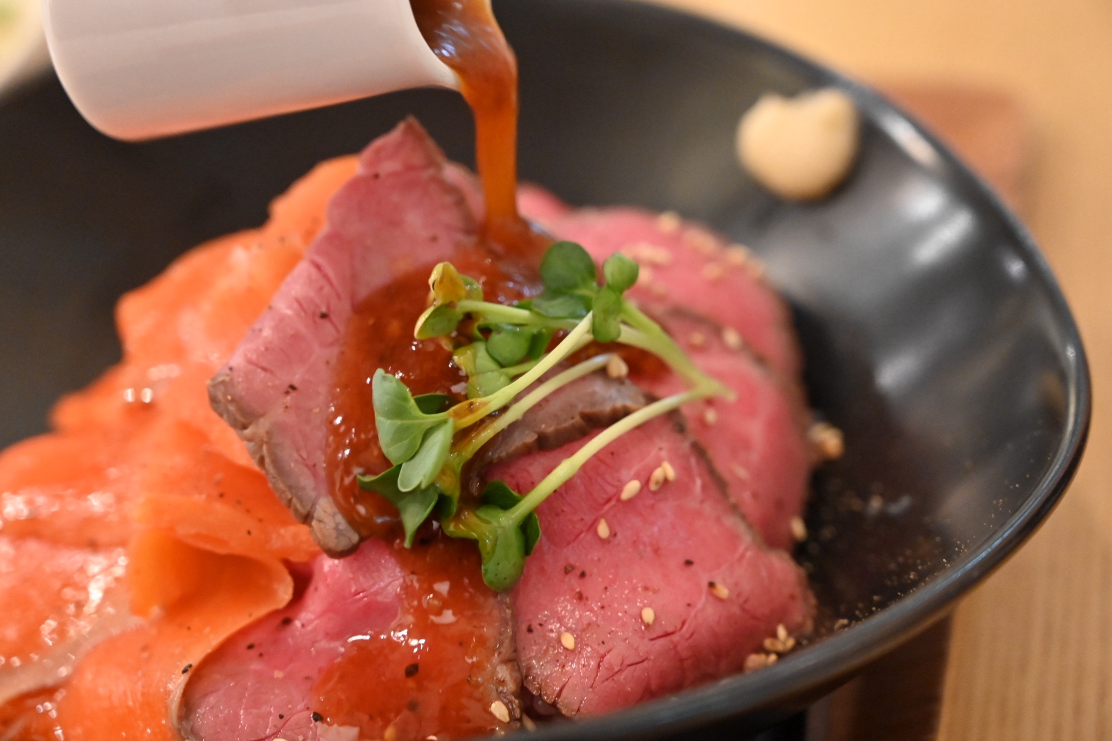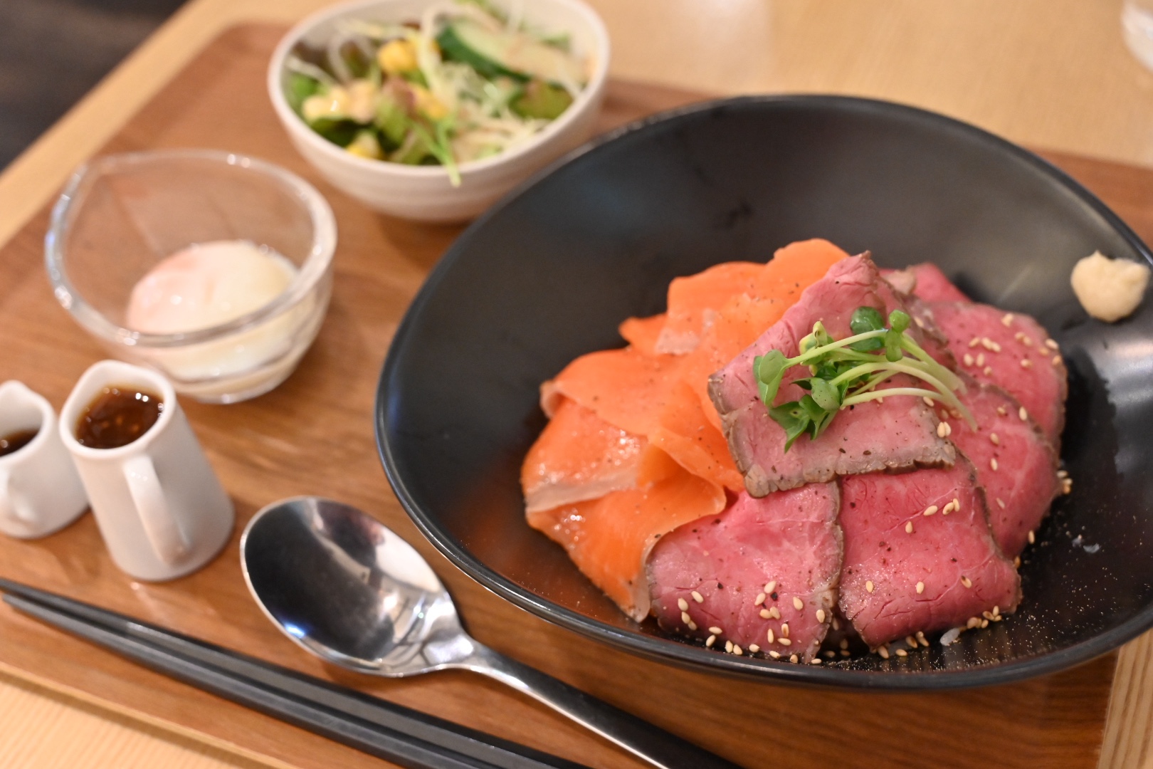 今日は左下に載っている特製ローストビーフ&スモークサーモンのコラボ丼(¥1230)に、肉大盛り(+¥300)にしてもらいました。