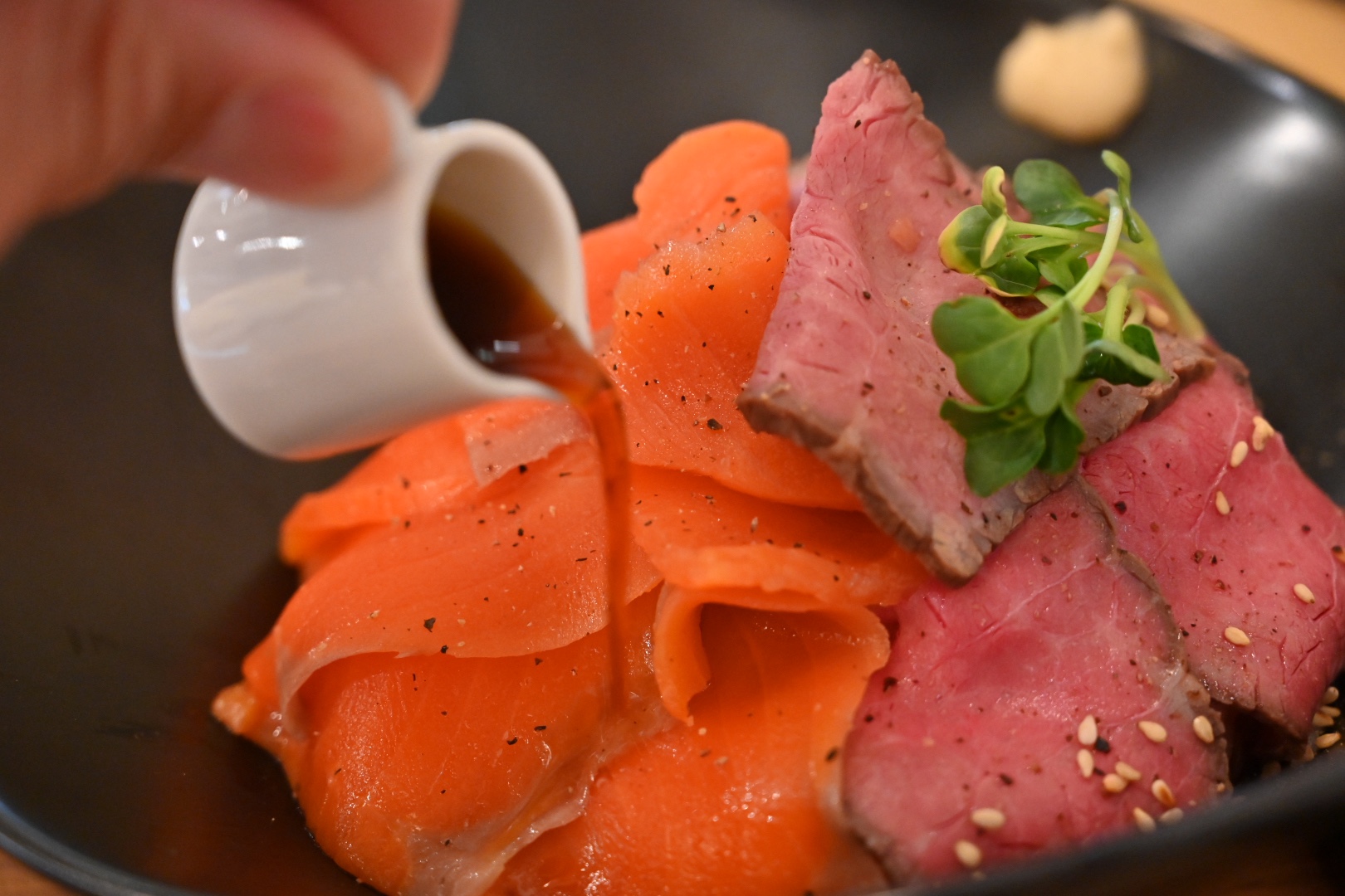ジャン!こちらが特製ローストビーフ&スモークサーモンのコラボ丼(¥1230)+肉大盛り(¥300)!