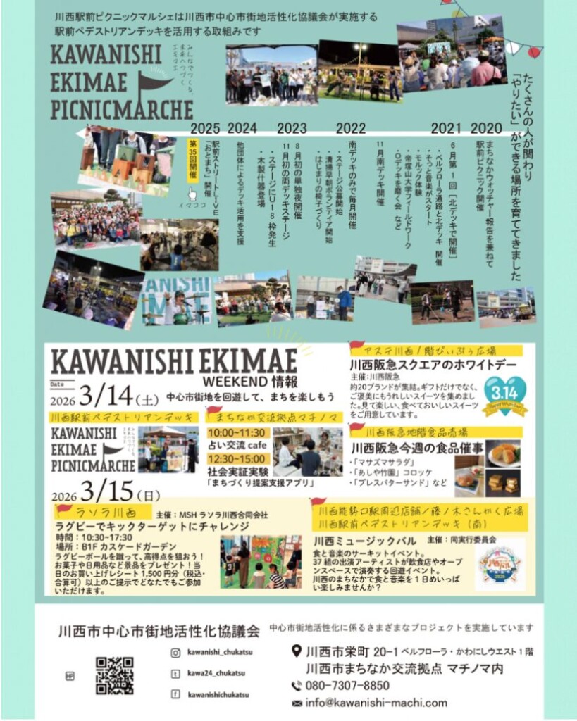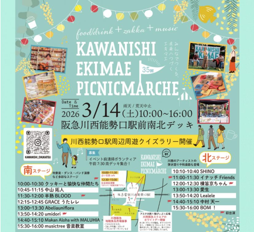 3/14(土)、川西能勢口駅前デッキで川西駅前ピクニックマルシェが開催されるみたい。