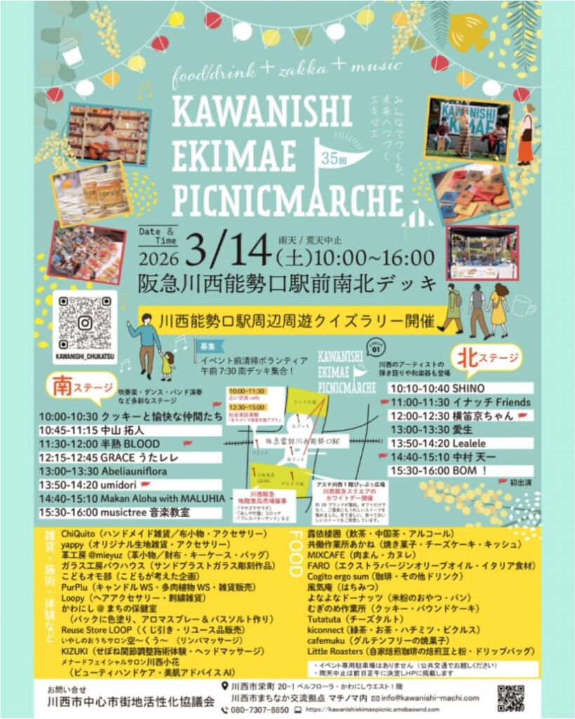 3/14(土)、川西能勢口駅前デッキで川西駅前ピクニックマルシェが開催されるようです!