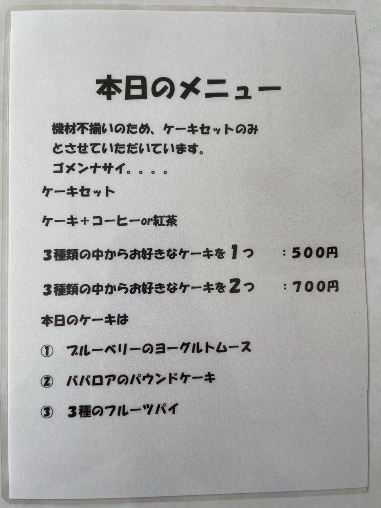 お腹を空かせてランチタイムにやってきたんですが、今日は機材が揃っていないそうで、ご覧のケーキセットのみの提供との事。
