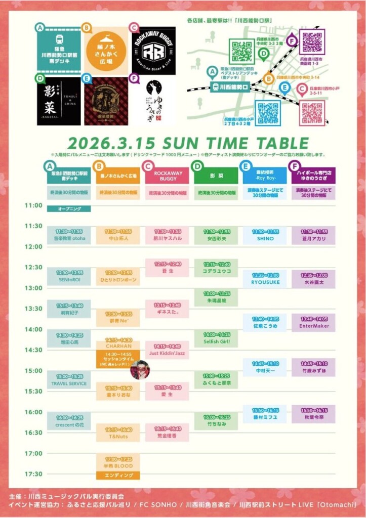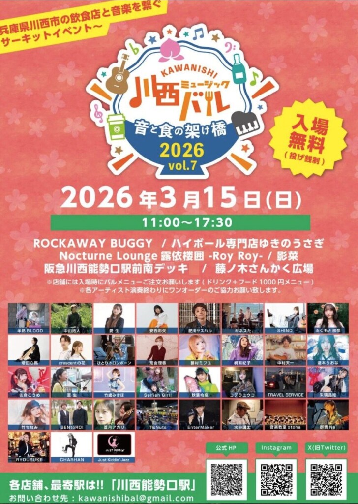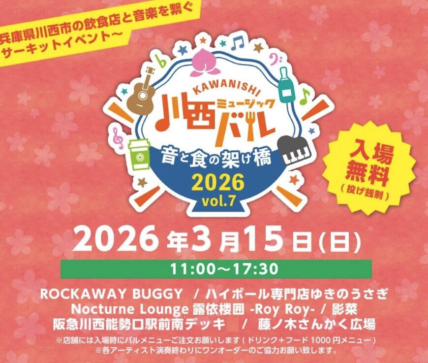 3/15(日)、川西市各所の飲食店と川西能勢口駅前で川西ミュージックバル〜音と食の架け橋〜2026が開催されるみたい。