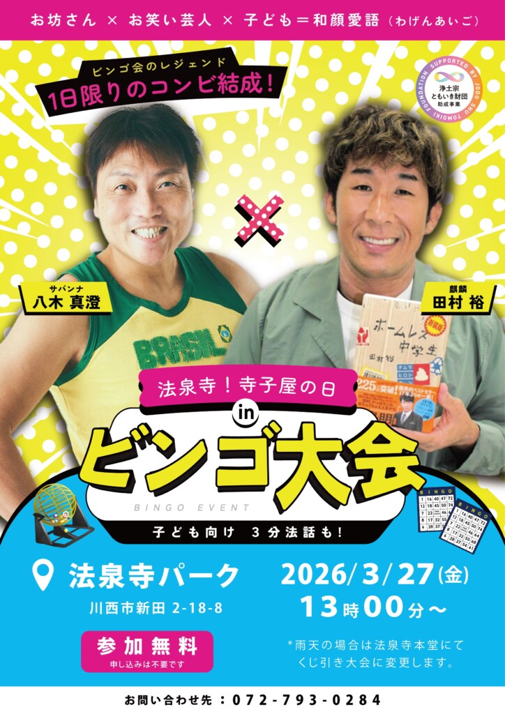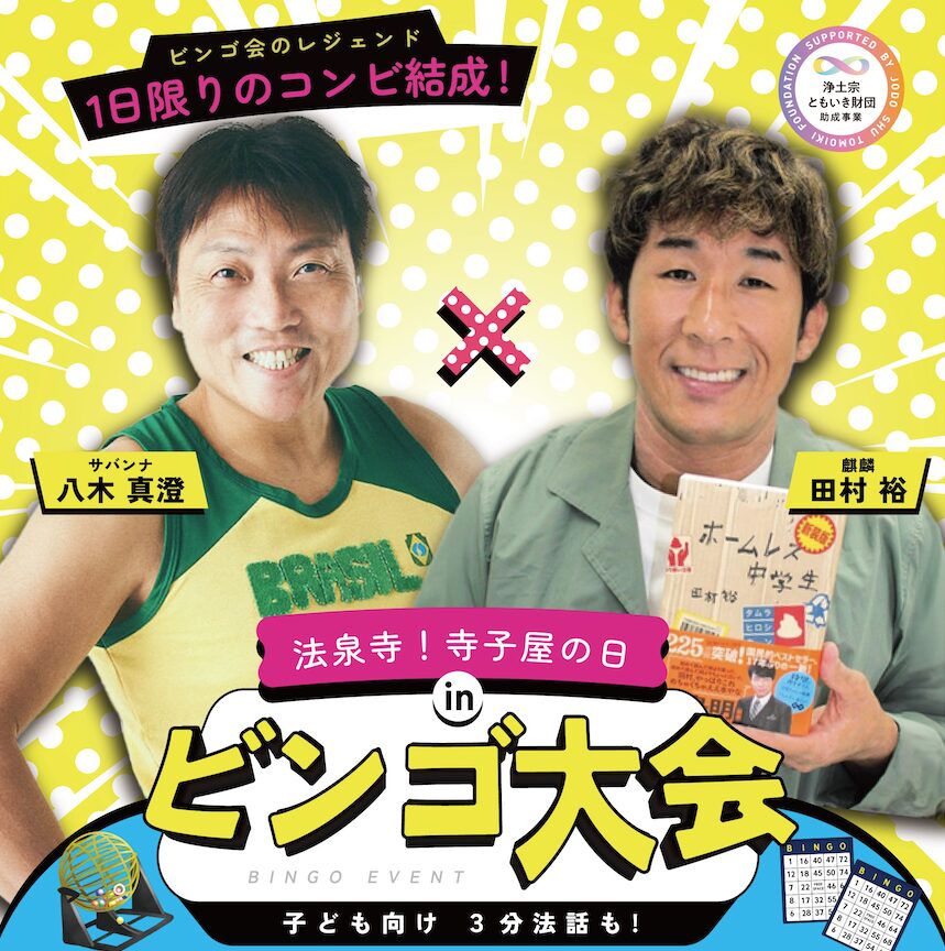 3/27(金)、サバンナ八木と麒麟田村がやってくる法泉寺 寺子屋 in ビンゴ大会が開催されるようです!