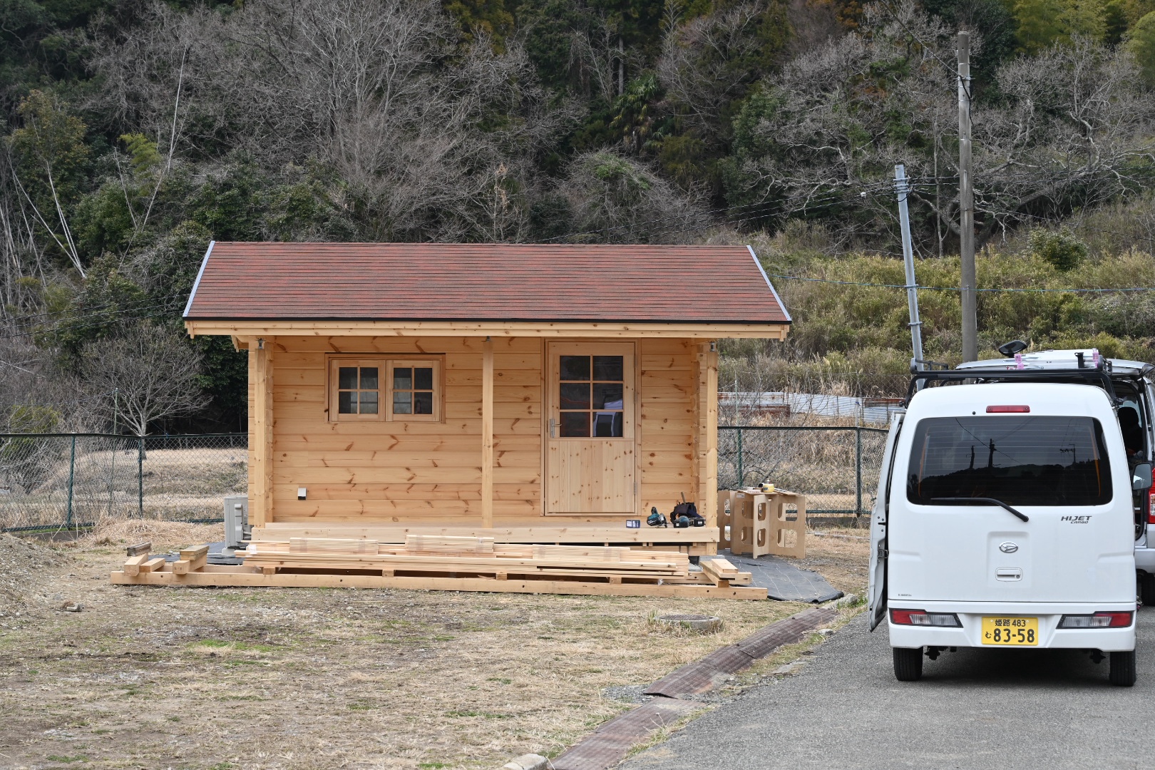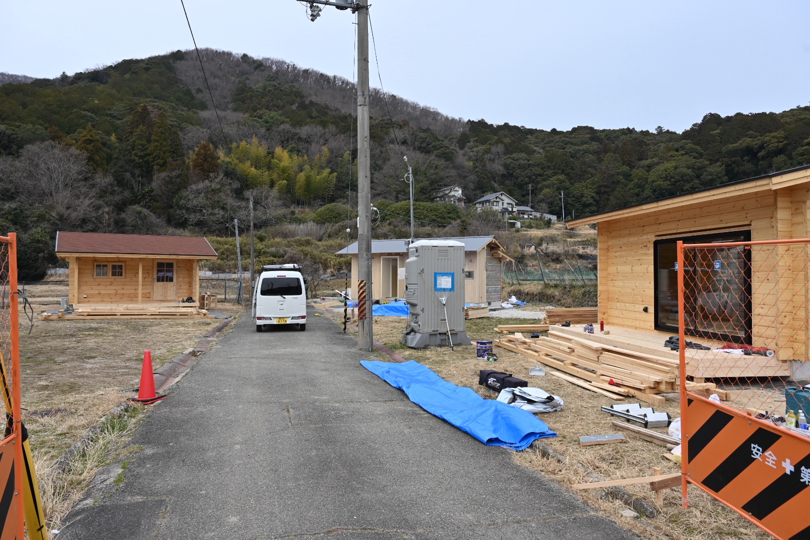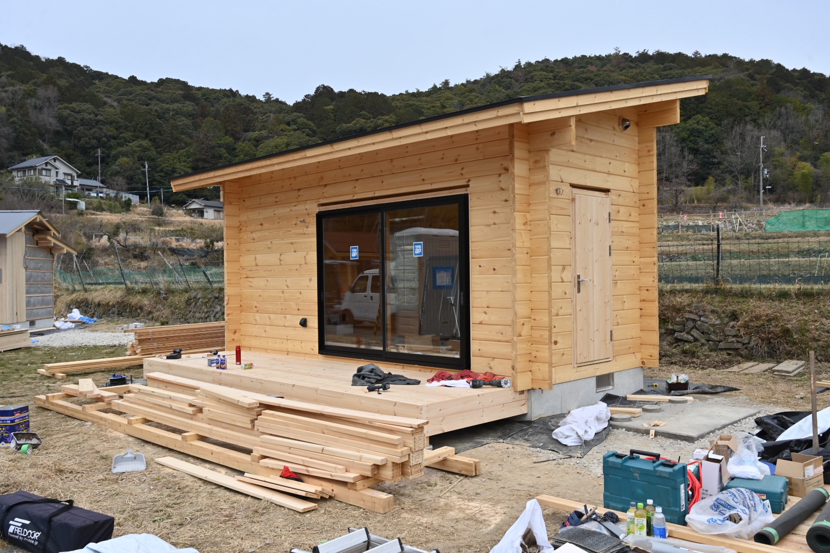 TSUMUGI BASE(ツムギバ)という名前で、5月半ばのオープンを目指して作っている二地域生活(デュアルライフ)を応援する実証実験のログハウスとの事。