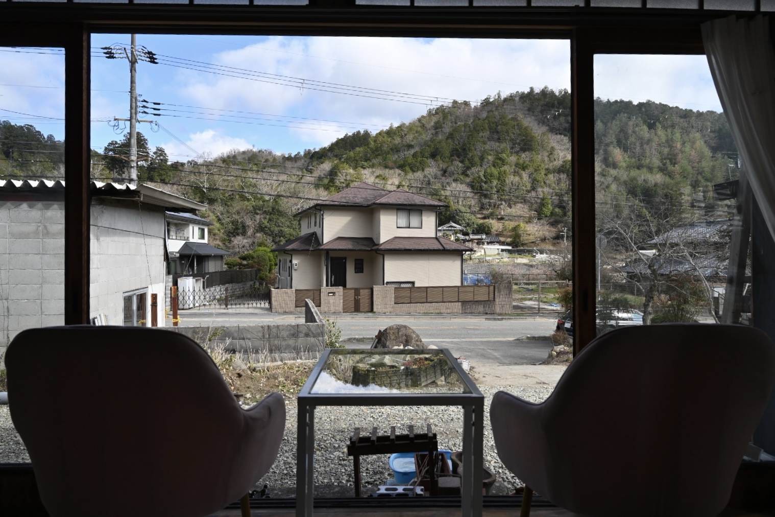 ここに椅子を置いて、外を眺めると鳥のさえずりが聞こえ、山々の緑が目に飛び込んで来るではないですか。