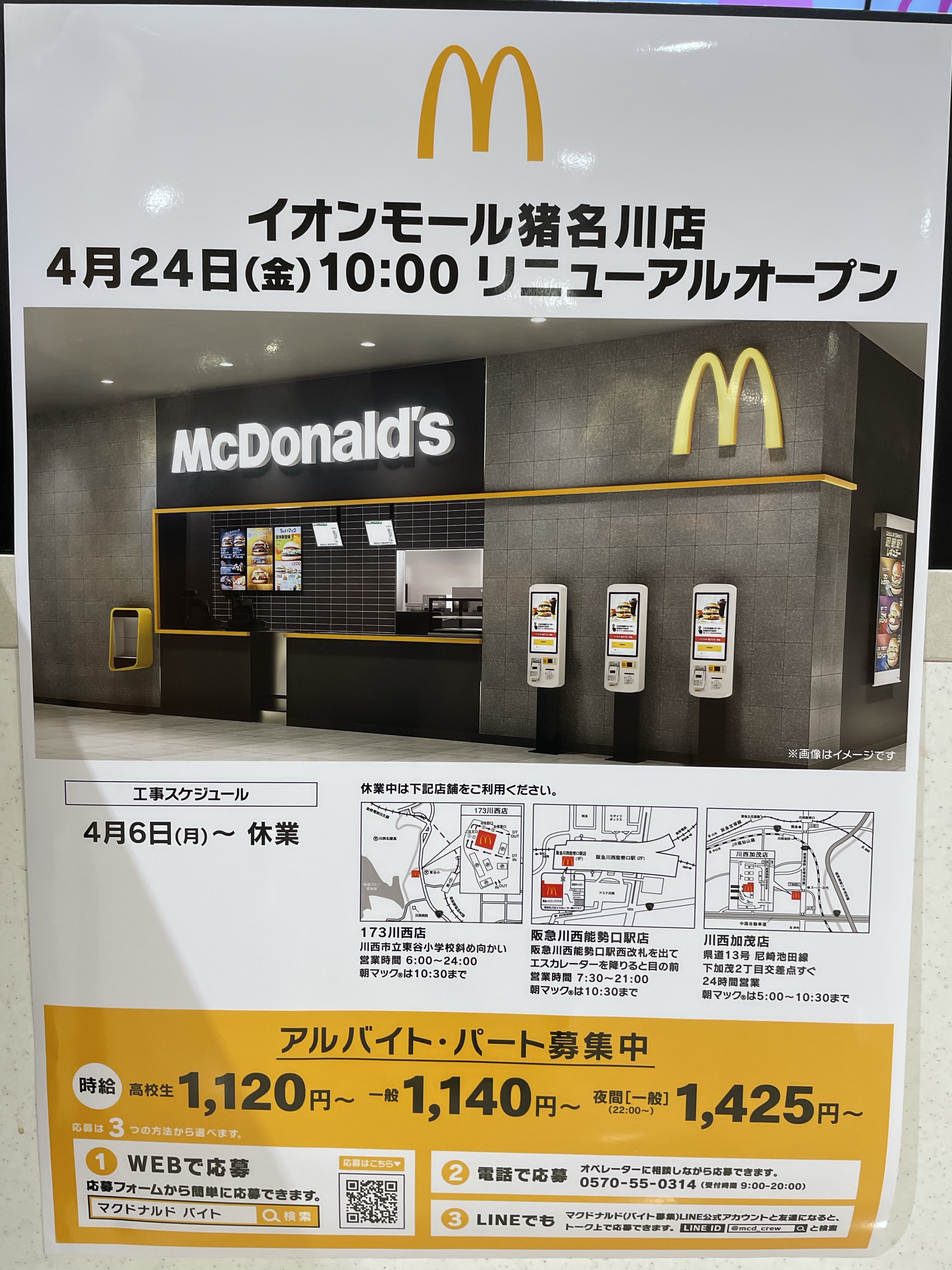 イオンモール猪名川のマクドナルドが4/6(月)〜24(金)〜までリニューアルのため休業するようです!