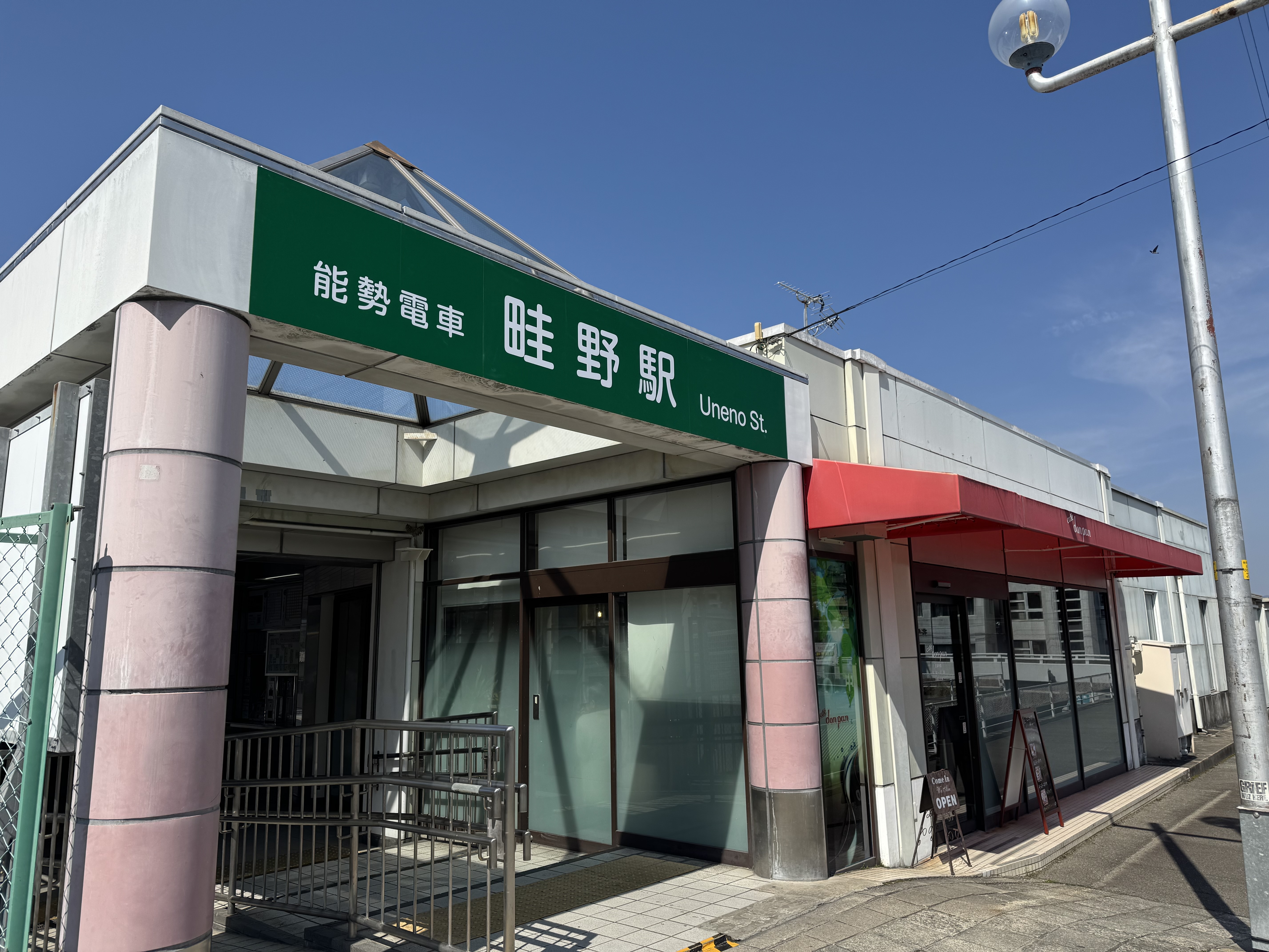 旧看板は「能勢電鉄 畦野駅」だったのが新看板では「能勢電車 畦野駅」になっていますね。