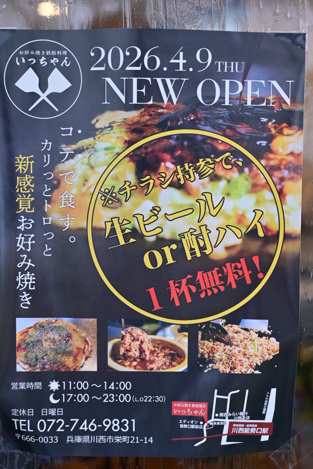 4/9(木)、川西市栄町のCALMのあった所に「お好み焼き鉄板料理いっちゃん」がオープンしたようです!