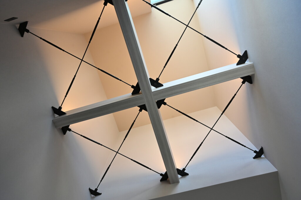 その沈んだ所から上を見上げると、吹き抜けが開放感を演出。