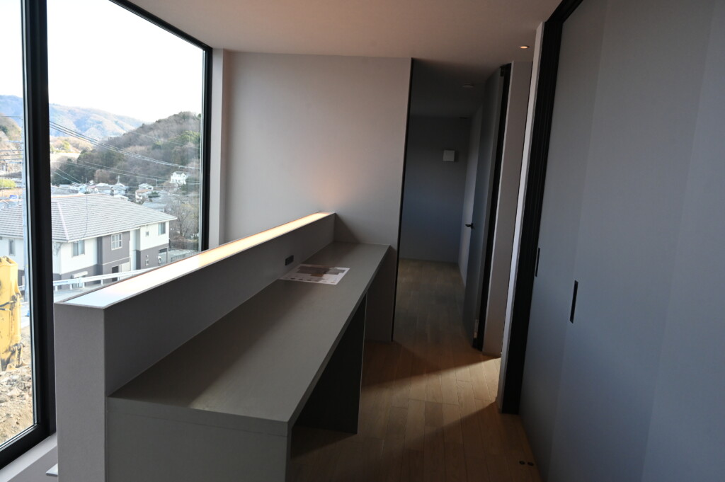 吹き抜けの前にデスクがあって、外の景色を見ながら勉強したり、お仕事を片付けたりできるようになっています。