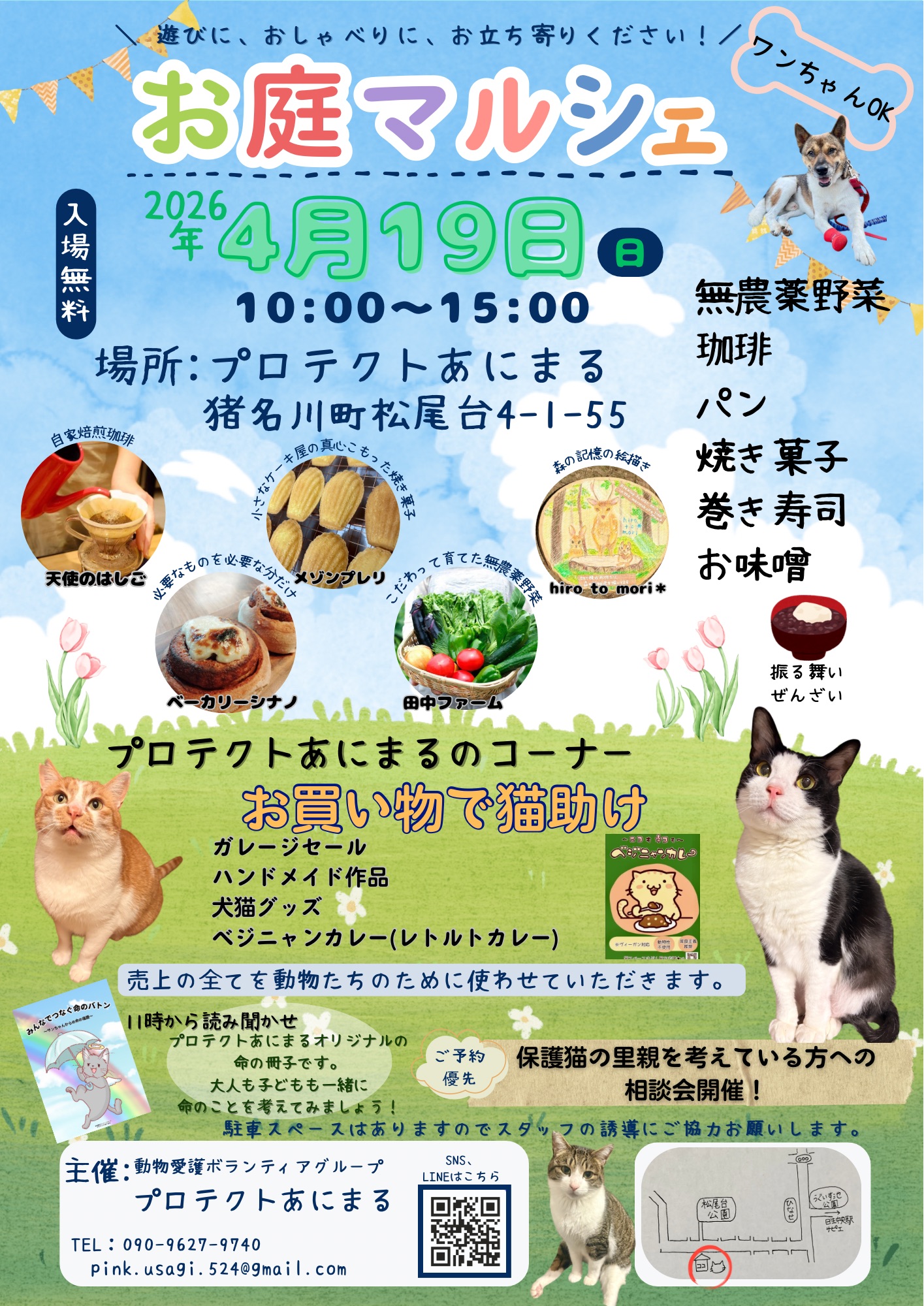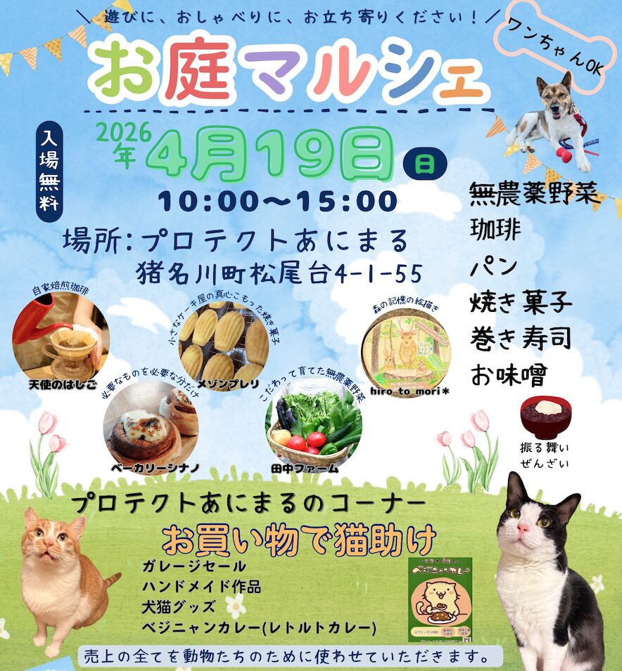 4月19日(日)、猪名川町松尾台にあるプロテクトあにまるでお庭マルシェを行います!