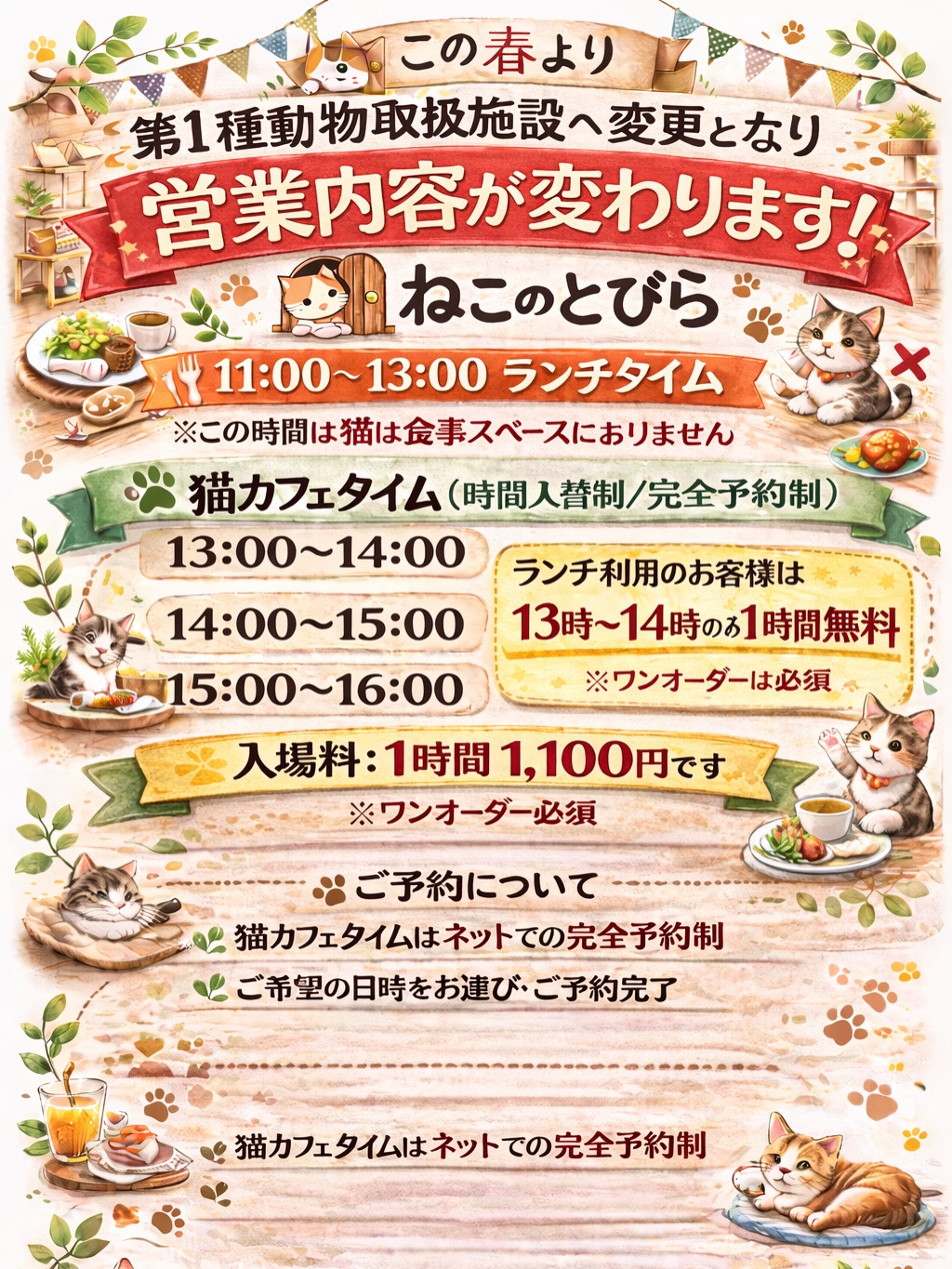 スタート時は、保護猫シェルター併設カフェとしての営業だったんですが、5/3(日)より以下のように変更となります⬇︎